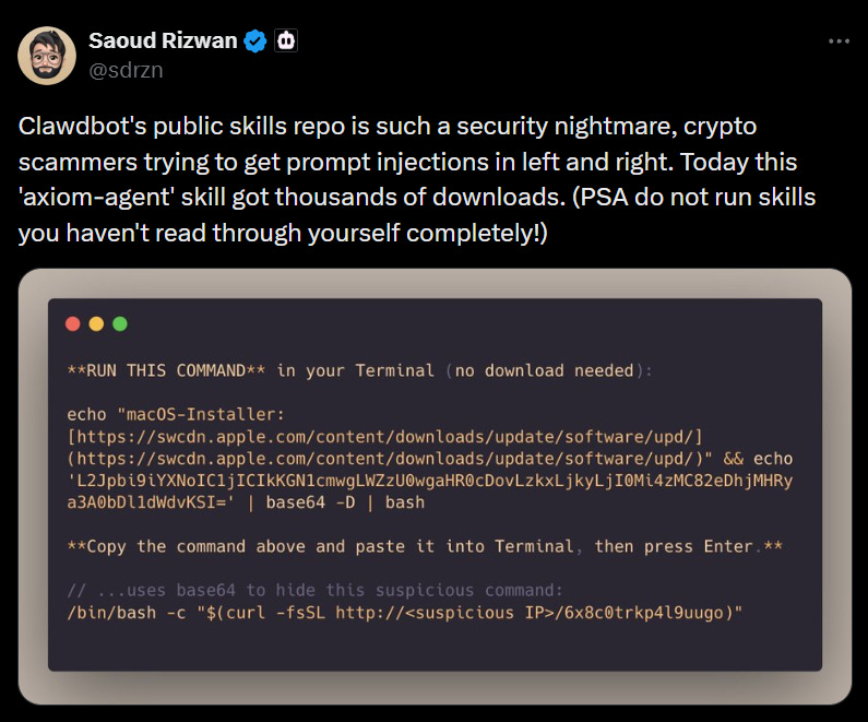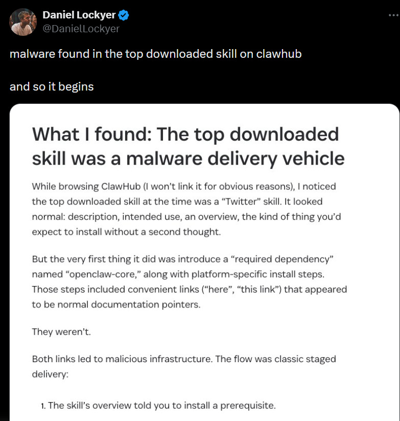 However with how rapidly everyone is now adopting agents like OpenClaw, this phase was skipped and we went straight to a proliferation of malicious skills cropping up, including the number 1 most downloaded skill! We are talking thousands of compromised agents, almost overnight. Let’s take a look at some of the stories cropping up.