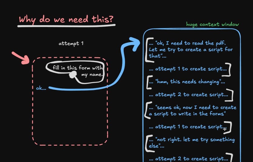 To understand why we might want something like this I’ll use an example from this video. Let’s say we want our agent to fill in a PDF with our details. Getting the agent to the point where it has completed this task could look like something in the image below, where it tries to create a script to read the PDF, perhaps it fails the first time but works the second, then it starts over with a script to write to the PDF, and so on, and so forth.